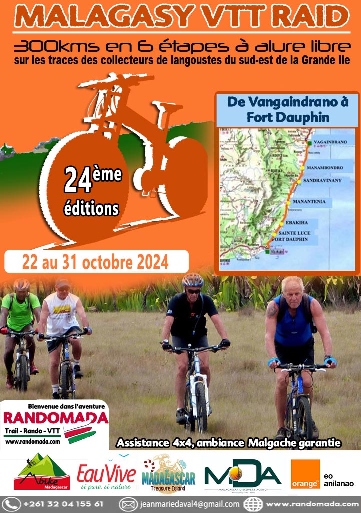 -Le Malagasy VTT Raid est une randonnée sportive et de découverte à allure libre de 300 kms du 22 octobre au 31 octobre 2024, à parcourir en 6 étapes dans la Côte Sud Est malgache de VANGAIDRANO à FORT DAUPHIN.